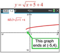 | On the logarithmic graph above, the calculator is "trying" to plot points on the graph to the left. But the graph is SO CLOSE to its vertical asymptote of x = -5, there is no room to put additional pixels before it crosses over the asymptote. Plotting points "straight" down would violate the graph being a function, and f (x) on the TI-Nspire plots functions. The logarithmic graph continues downward toward negative infinity approaching the asymptote x = -5. (Graphing it as a "relation" won't help.) |